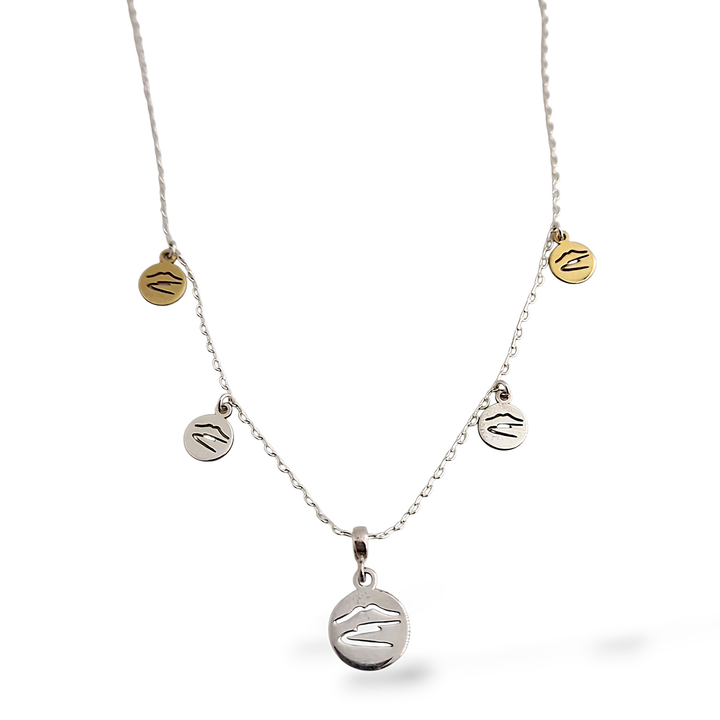 Collana charms collezione O'Vesuvio un gioiello semplice ma ed elegante adatto a qualsiasi outfit, per chi desidera portare Napoli sempre con se. Realizzata argento 925 con 5 charms Vesuvio 2 argento placcato oro, 2 argento rodiato misura 1cm e uno centrale misura 2cm, misura collana 45cm, la catena della collana ha una lavorazione molto particolare come evidenziato dalle foto.